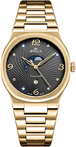 Стильный женский аксессуар. Коллекция Moonface. Кварцевый механизм. Циферблат: черный, с узором в виде линий, расходящихся по спирали от круглой апертуры даты на «6 часах». Накладные арабские цифры, 8 бриллиантовых часовых меток, скелетонизированные часовая и минутная стрелки. Секторная апертура «фаз Луны» в верхней части циферблата. 36,5-мм корпус, интегрированный браслет с PVD-покрытием цвета желтого золота. Маркировка «Swiss Made».